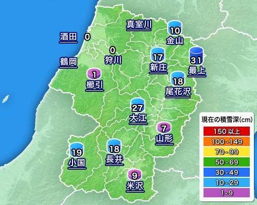 但し、鶴岡、真室川は、アメダス観測地点がないため、積雪深の表示はありません。